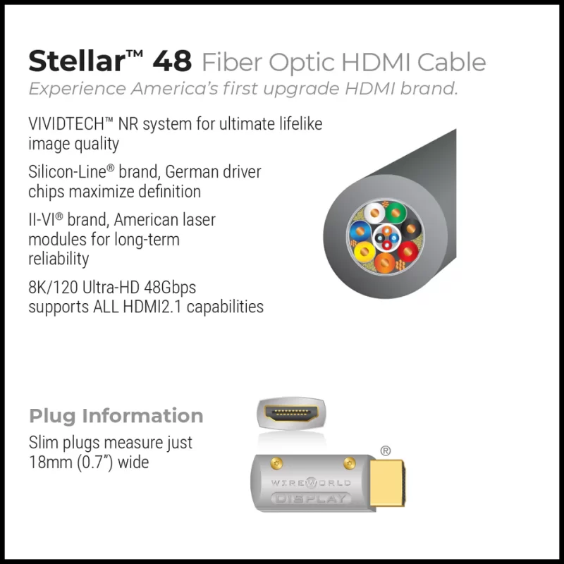 בקיצור, כבל ה-Stellar™ 48 Fiber Optic HDMI הוא כבל HDMI מתקדם ביותר המיועד למשתמשים הדורשים את הביצועים הטובים ביותר ממערכות קולנוע ביתיות או אודיו-וידאו מקצועיות ברמה גבוהה, במיוחד כאשר נדרשים מרחקים ארוכים. הוא תומך בתקני HDMI העדכניים ביותר ומשלב טכנולוגיות מתקדמות כדי להבטיח איכות תמונה וצליל מעולה.